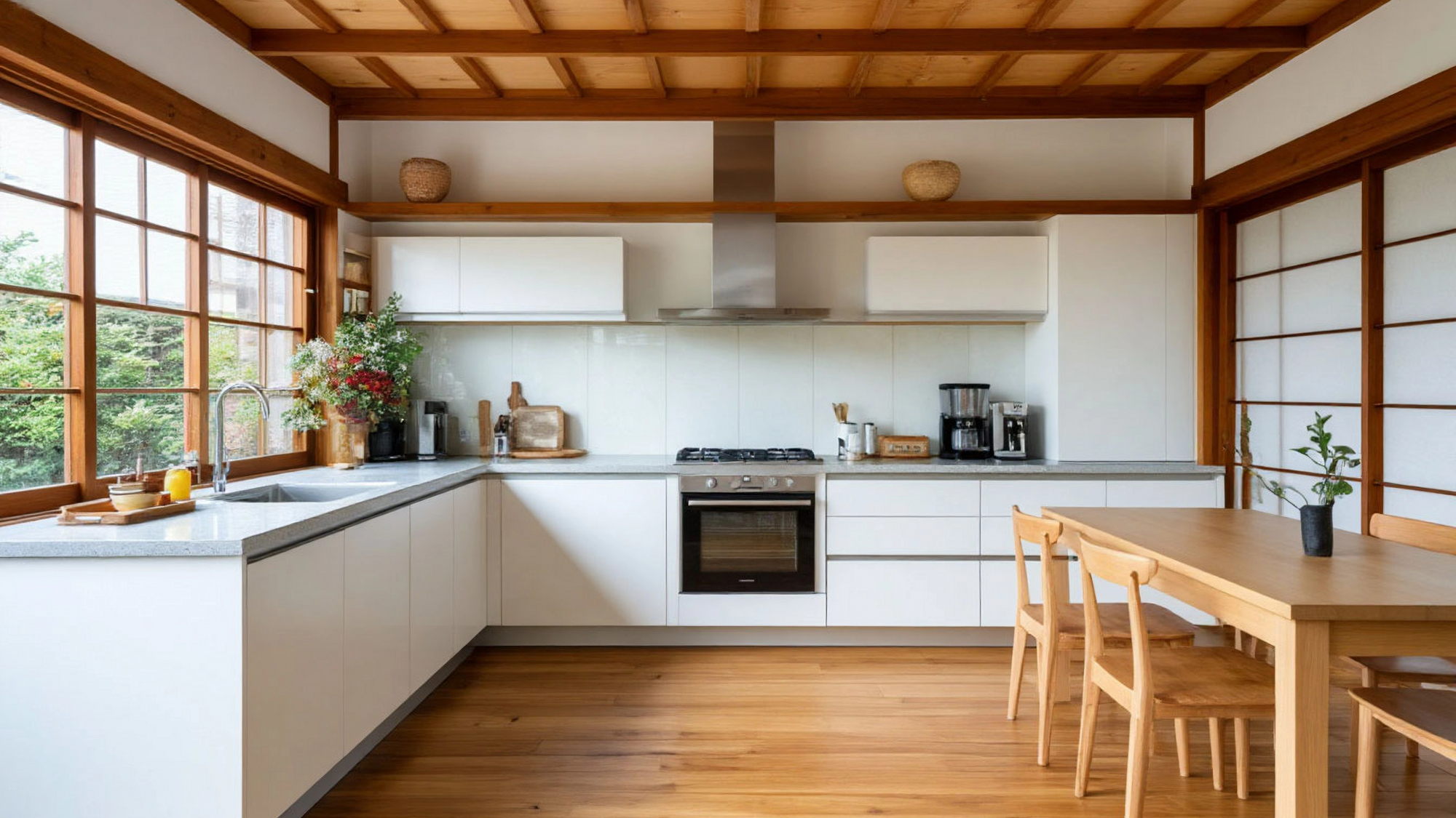Кухня "Киока" создана из материалов, которые дарят ощущение природности. Здесь встречаются гладкие деревянные поверхности, лёгкий матовый блеск фурнитуры, тактильная мягкость натуральных текстур. Белый фасад подчеркивает естественную структуру дерева — это не стерильная белизна, а живая, теплая, как солнечный свет, проходящий через бумажные перегородки сёдзи. Контрасты минимальны, но выразительны: акцентом может стать чёрная варочная панель, керамические элементы ручной работы, мягкий серо-бежевый фартук из фактурной плитки, напоминающей японский камень.